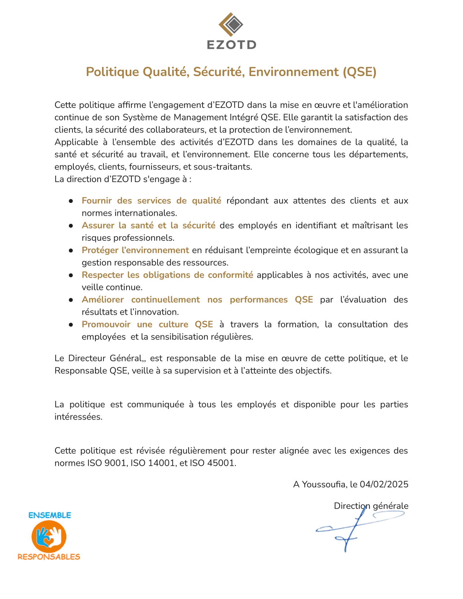 Chez EZOTD, nous sommes déterminés à offrir une qualité de service irréprochable à nos Clients tout en agissant de manière responsable envers notre environnement et la sécurité de notre personnel. Pour atteindre cet objectif, nous avons adopté des normes rigoureuses en matière de sécurité et d’environnement telles que les normes ISO 9 001 et 14 001 et ISO 45001.